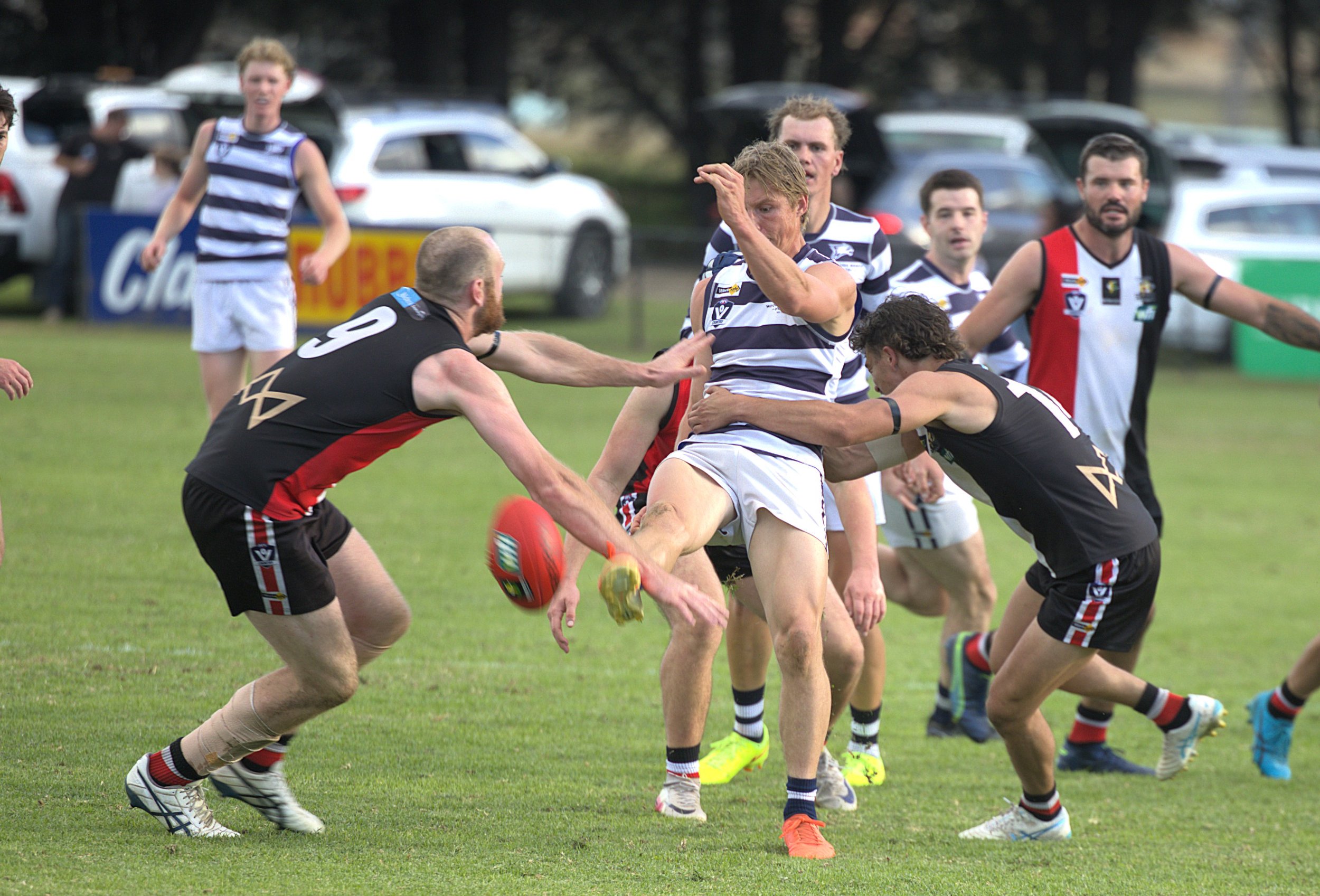 Adam Janssen tries to break clear of the Cowwarr tackle