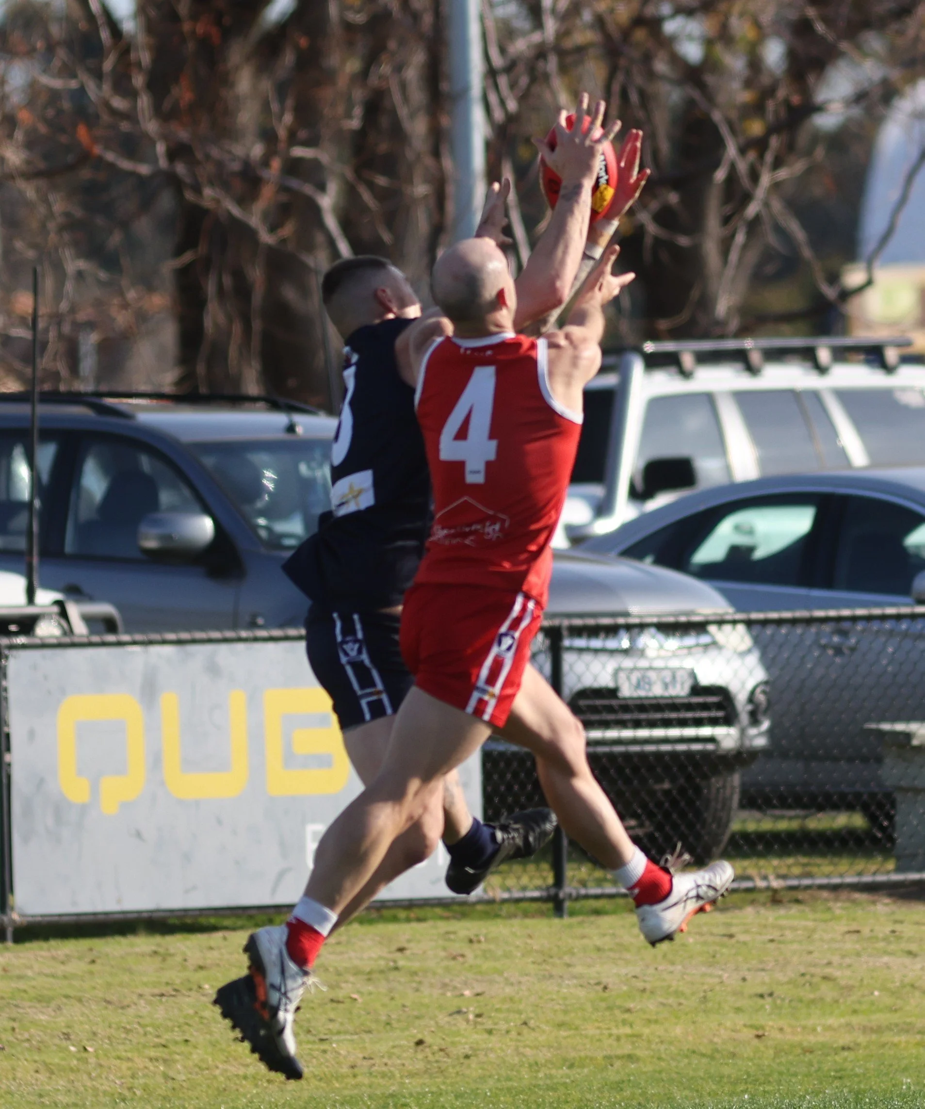 Yarram’s Keifer Sutherlands and his YYN opponent attempt to mark in the Yarram forward line